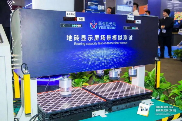 同時,由國家CNAS認可的新亞勝光電實驗室出品的地磚顯示屏承重測試設備同期亮相,模擬汽車碾壓、人體踩踏測試,向觀眾展示了MG系列箱體在500Kg壓力下,反復測試5000次無異!,F(xiàn)場實測引來眾人圍觀,硬核實力贏得大家的信賴與高度認可。