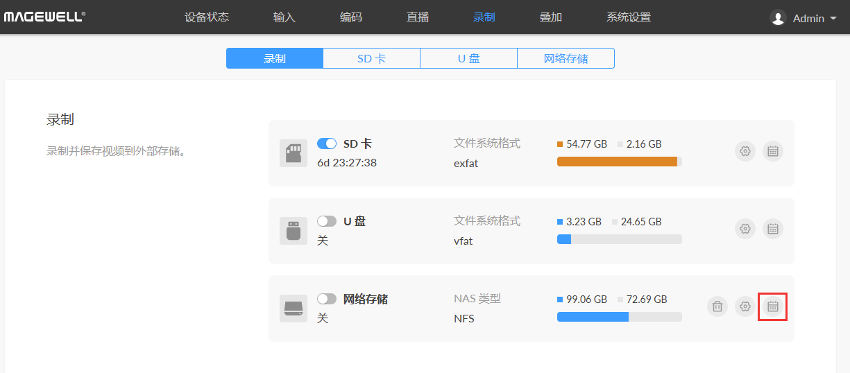 1、登錄編碼盒Web GUI,選擇“錄制>錄制”頁簽,找到“網(wǎng)絡(luò)存儲(chǔ)”,點(diǎn)擊紅框標(biāo)注的“小齒輪”,進(jìn)入網(wǎng)絡(luò)存儲(chǔ)配置頁面。