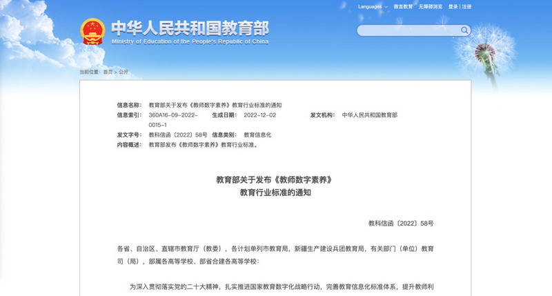 2022.12.09教育部發(fā)布《教師數(shù)字素養(yǎng)》教育行業(yè)標準,以扎實推進國家教育數(shù)字化戰(zhàn)略行動,完善教育信息化標準體系,提升教師利用數(shù)字技術優(yōu)化、創(chuàng)新和變革教育教學活動的意識、能力和責任。