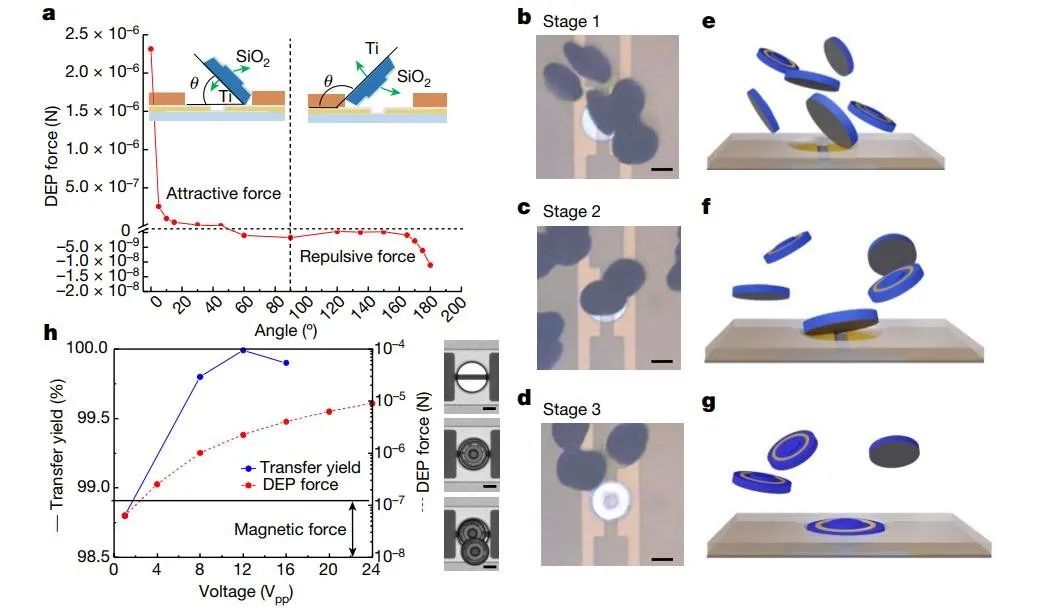 圖3:形狀失配缺陷的顯微鏡圖像和示意圖,以及作為受體孔高度函數(shù)的電泳DEP力和轉(zhuǎn)移屈服的變化。
