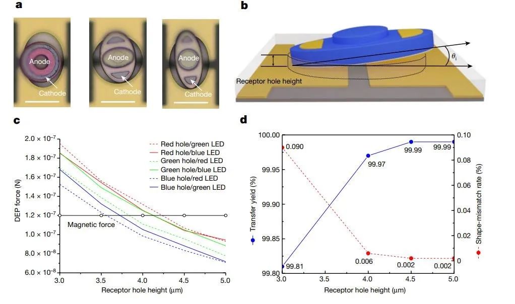 5月3日,韓國 LG電子(LG Electronics)Wonjae Chang, Jungsub Kim,Jeong Soo Lee等,在Nature上發(fā)文,提出了一種基于流體自組裝(FSA)技術(shù)的新轉(zhuǎn)移方法,稱為磁力輔助介電泳自組裝技術(shù)(MDSAT),它結(jié)合了磁力和介電泳(DEP)力,在15分鐘內(nèi),實(shí)現(xiàn)了同時(shí)的紅色,綠色和藍(lán)色(RGB) LED轉(zhuǎn)移,轉(zhuǎn)移良率為 99.99%。