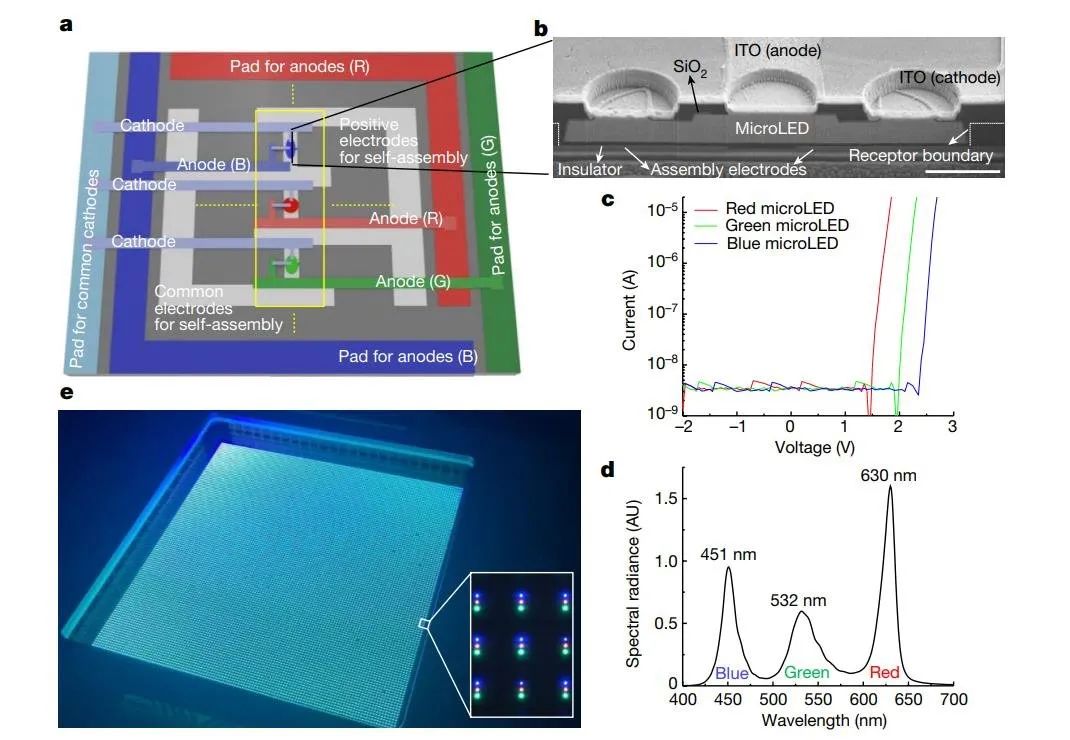 圖4:無源矩陣微發(fā)光二極管MicroLED面板的圖像,I–V特性和RGB光譜。