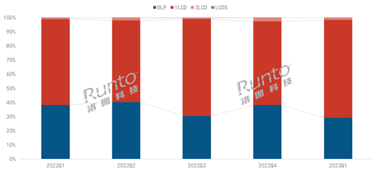 目前,從公布的數(shù)據(jù)來(lái)看, 相對(duì)其他消費(fèi)電子產(chǎn)品,投影儀全球市場(chǎng)保持著明顯較快的增長(zhǎng)速度,國(guó)內(nèi)外的市場(chǎng)需求持續(xù)旺盛,而DLP市場(chǎng)持續(xù)萎縮,銷量大幅下降,1LCD技術(shù)的線上市場(chǎng)份額提升,原因在于近兩年遭受芯片短缺影響,曾經(jīng)占據(jù)市場(chǎng)主流的DLP投影儀份額被LCD搶占。同時(shí),LCD投影成為很多新興品牌進(jìn)入市場(chǎng)的切入選擇,2023年的1LCD市場(chǎng)的競(jìng)爭(zhēng)也將劇增。