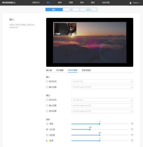 Ultra Encode AIO可分別對(duì)接入的HDMI和SDI信號(hào)進(jìn)行色彩設(shè)置,包括色彩空間、量化范圍、飽和范圍、亮度、對(duì)比度、飽和度和色調(diào)。