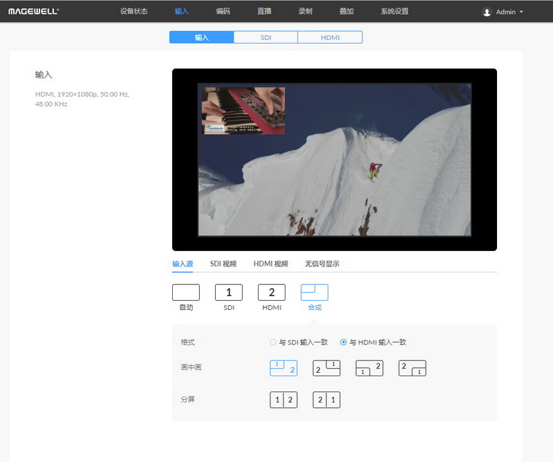當(dāng)Ultra Encode AIO同時(shí)接入HDMI和SDI信號(hào)時(shí),用戶可以任意選擇一路視頻源進(jìn)行編碼,也可以將兩路信號(hào)組合成畫中畫或并排形式編碼。用戶可自由選擇合成畫面的分辨率幀率等格式與HDMI或SDI信號(hào)保持一致。