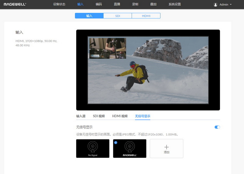 此外,還可設(shè)置當(dāng)Ultra Encode AIO無信號(hào)接入時(shí)顯示的畫面,可以選“No Signal”或“MAGEWELL”圖標(biāo),還可以選擇自定義圖片。(注:自定義圖片必須是JPEG格式,不超過1920x1080,1.00MB)