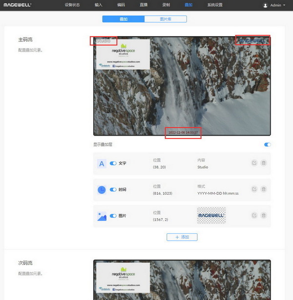 用戶可以對(duì)Ultra Encode AIO主次碼流配置疊加元素,即支持在畫面上添加包括文字、圖片和時(shí)鐘3種元素。用戶可以任意組合這三種元素同時(shí)顯示在畫面上,最多支持添加8個(gè)元素。