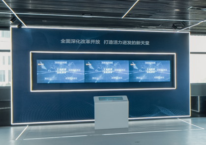 該展項采用L型屏聯(lián)動觸摸查詢裝置開啟連屏影音演繹,圍繞城西科創(chuàng)大走廊空間布局,逐次解析大走廊未來規(guī)劃,墻地聯(lián)動立體展開一幅大走廊未來藍(lán)圖畫卷。游客可以通過查詢裝置,了解大走廊的相關(guān)信息。