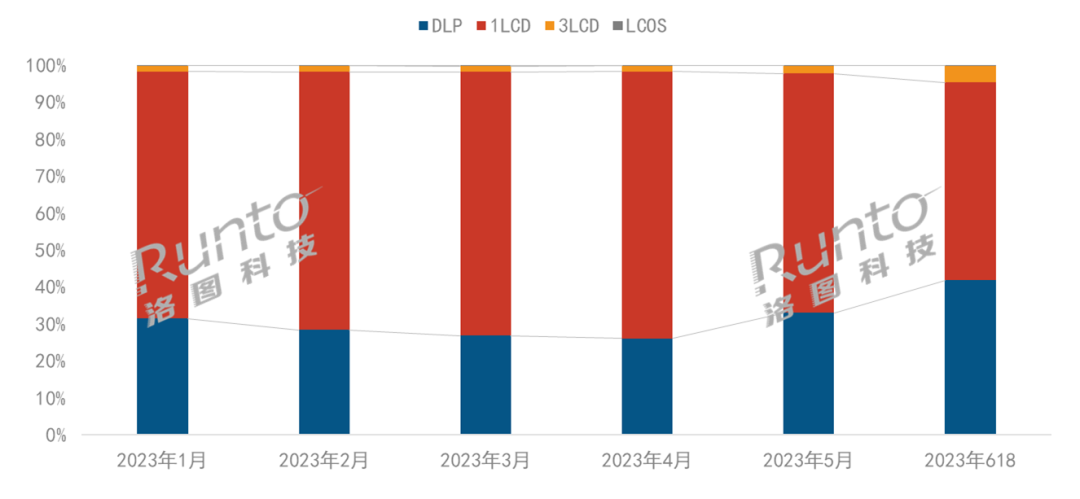 以DLP為代表的中高端主流品牌降價(jià)促銷(xiāo)幅度相對(duì)更大,其市場(chǎng)占比呈現(xiàn)回升。根據(jù)洛圖科技(RUNTO)線上監(jiān)測(cè)數(shù)據(jù)顯示,2023年618期間,DLP產(chǎn)品的銷(xiāo)量份額達(dá)到42%,盡管仍低于去年618的47%,但已經(jīng)顯著高于今年前五個(gè)月的水平。2023年1-5月中,DLP占比最高的是5月,當(dāng)月份額僅為33%。