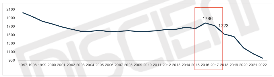圖一:1997-2022年中國出生人口統(tǒng)計情況