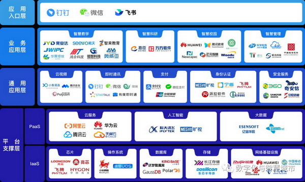 根據(jù)智慧教育業(yè)務(wù)參考模型對應(yīng)用的劃分,我們可以將所有國內(nèi)從事智慧教育的產(chǎn)品和服務(wù)廠商分為平臺支撐層(包括IaaS和PaaS)、通用應(yīng)用層、業(yè)務(wù)應(yīng)用層和應(yīng)用入口層。