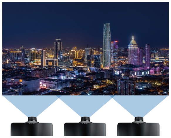 兩臺(tái)及多臺(tái)投影機(jī)可通過機(jī)器內(nèi)置的變形和融合設(shè)置功能形成一個(gè)大畫面,配合特定顯卡,無需融合器即可完成多畫面的融合。