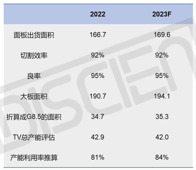 圖一:2023年TV面板出貨面積預測及產(chǎn)能利用率推算