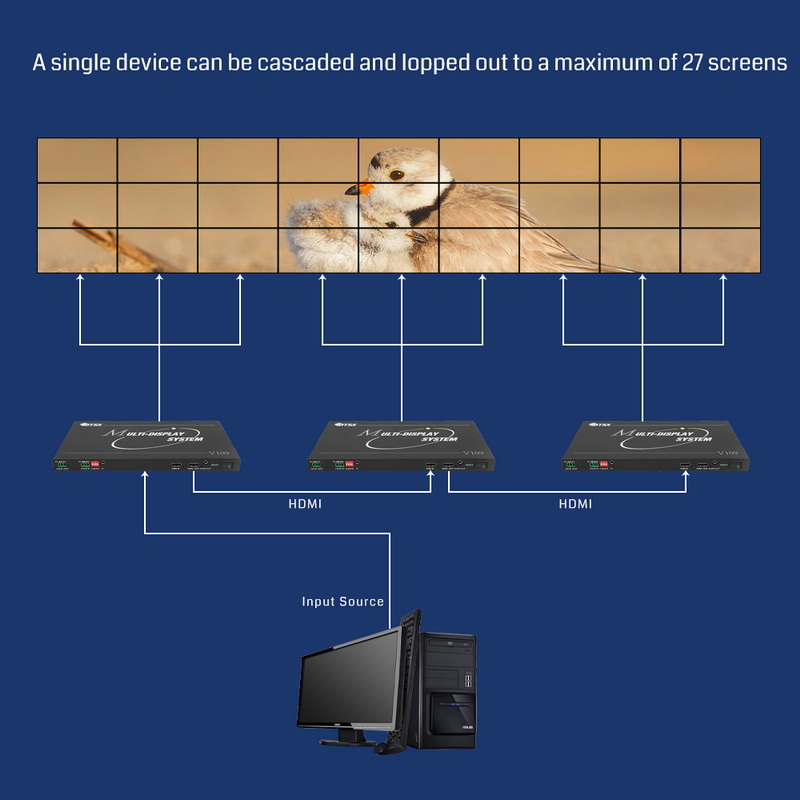 使用一臺1進9出4K60點對點拼接處理器(BIT-VWC-XL109),您可以輕松解決原本需要三臺多屏擴展儀(1進3出)才能實現(xiàn)的場景。