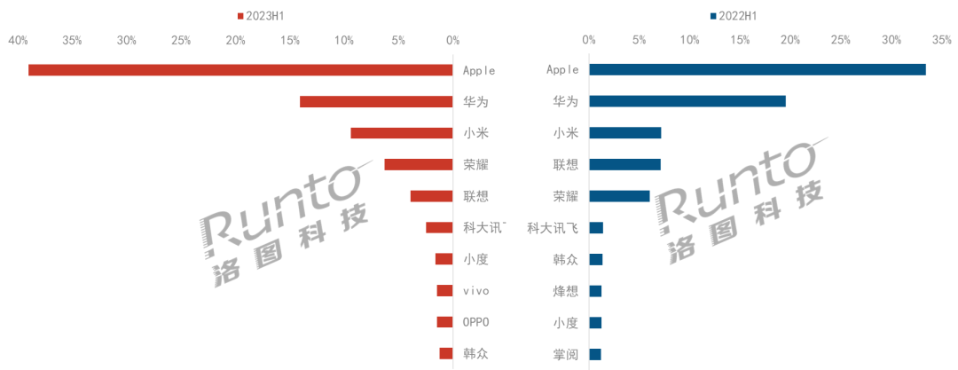 蘋果、華為、小米穩(wěn)定占據(jù)TOP3,合計份額達62.5%。盡管蘋果在上半年并未推出新品,但在教育優(yōu)惠、返校促銷、年中大促等活動帶動下,份額比去年同期增長了5.6個百分點。