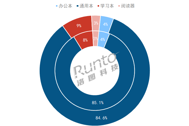 根據(jù)洛圖科技(RUNTO)線上監(jiān)測數(shù)據(jù)顯示,2023年上半年,通用本銷量占比為84.6%,較去年同期下降了0.5個百分點;學(xué)習(xí)本占比為9%,較去年同期增加了1個百分點;閱讀器(注:Kindle不屬于智能平板)和辦公本占比分別達到4%和3%,市場占比較為穩(wěn)定。