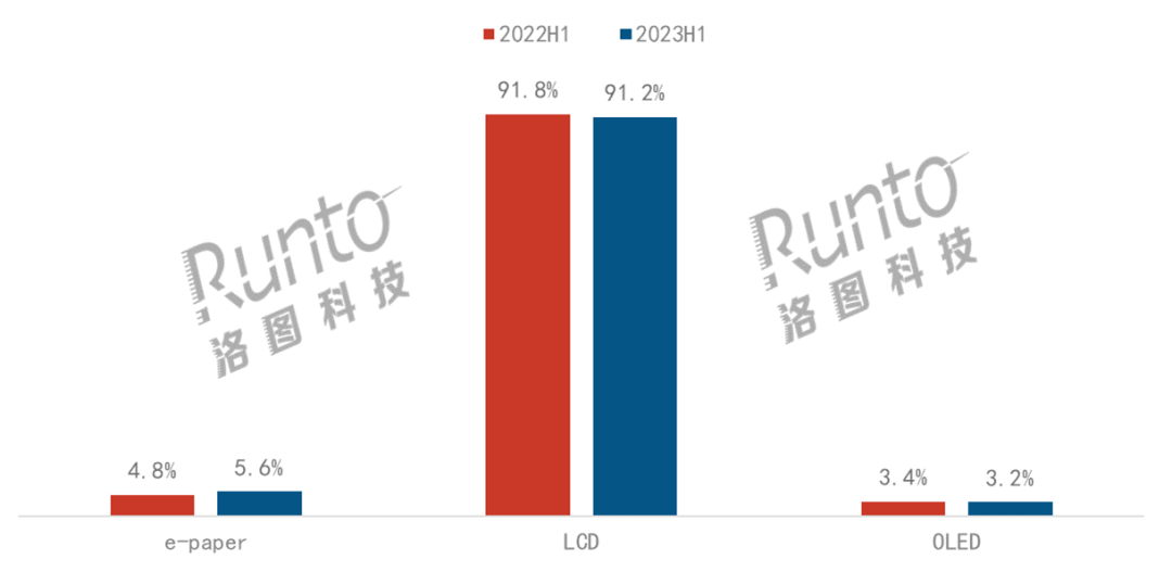 根據(jù)洛圖科技(RUNTO)線上監(jiān)測數(shù)據(jù)顯示,2023年上半年,智能平板屏幕類型以LCD(液晶顯示)為主,占比達到91%,較去年同期下降0.6個百分點。