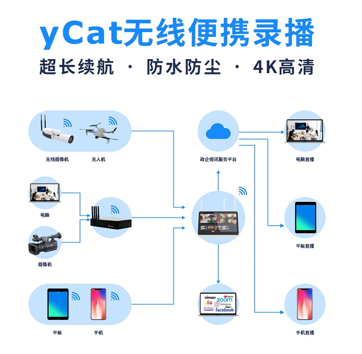 yCat無(wú)線便攜錄播整體設(shè)計(jì)輕巧、無(wú)線無(wú)電,全設(shè)備自動(dòng)連接,5分鐘極速搭建,內(nèi)置電池一次充滿電可連續(xù)使用8小時(shí),超強(qiáng)穩(wěn)定的續(xù)航可滿足長(zhǎng)時(shí)間活動(dòng)直播、錄制的需求,搭配機(jī)身IP66級(jí)防水防塵,可適應(yīng)各種惡劣環(huán)境。無(wú)論何時(shí)何地,yCat無(wú)線便攜錄播解決方案可滿足任意場(chǎng)景的直播錄制,打破了錄播場(chǎng)地的限制,讓錄播場(chǎng)景更加多元化。