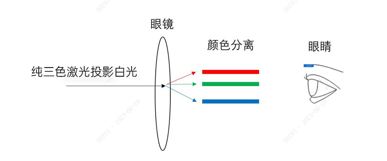 彩邊不同于投影光學系統(tǒng)的橫向色差(Lateral Chromatic Aberration)導致的色散現(xiàn)象,它無法通過鏡頭的消色差來解決,觀看角度和距離不同、人眼屈光度散光度不同人眼處觀察到的彩邊程度也不同,僅能通過使用寬光譜光源改善彩邊。