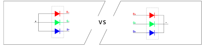如大家所熟知,LED顯示屏的核心組成元器件是發(fā)光二極管,發(fā)光二極管跟普通二極管一樣具有正向?qū)ǖ奶匦,也就是說(shuō)有正極和負(fù)極之分。共陽(yáng)極是指單個(gè)LED通過(guò)其正極連接,由負(fù)極驅(qū)動(dòng);而共陰極則相反,是指單個(gè)LED通過(guò)其負(fù)極連接,由正極驅(qū)動(dòng)。