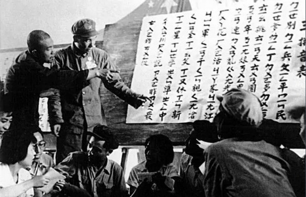 在建國(guó)初期,中國(guó)面臨著超過80%的文盲比率。為了解決這個(gè)問題,全國(guó)掀起了一場(chǎng)雄心勃勃的掃盲運(yùn)動(dòng)。那時(shí)的黑板并非是現(xiàn)代普遍使用的綠板,而可能只是簡(jiǎn)陋的木板或者墻壁,擺放在田野邊或者草地上。