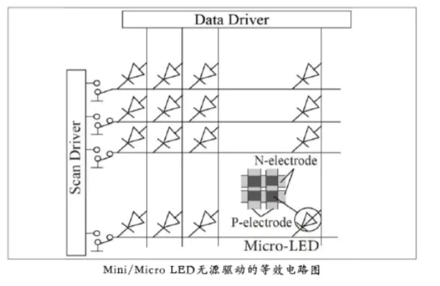 無源驅(qū)動(dòng)方式把每一列像素的陽(yáng)極(P-electrode)連接到列數(shù)據(jù),每一行像素的陰極(N-electrode)連接到行掃描線。某特定的行和列有電流信號(hào)通過時(shí),在行列交叉處的像素單元將會(huì)被點(diǎn)亮。逐行地對(duì)每個(gè)像素施加不同的電壓,每個(gè)像素能夠?qū)崿F(xiàn)不同的亮度顯示,以點(diǎn)陣的方式動(dòng)態(tài)顯示圖像。采用Mini/MicroLED無源驅(qū)動(dòng)技術(shù)會(huì)導(dǎo)致電流密度過高,線間存在串?dāng)_,矩陣上不同布線長(zhǎng)度的阻抗存在偏差等問題,Mini/MicroLED顯示器的分辨率、亮度、可靠性和畫面質(zhì)量均受到限制。