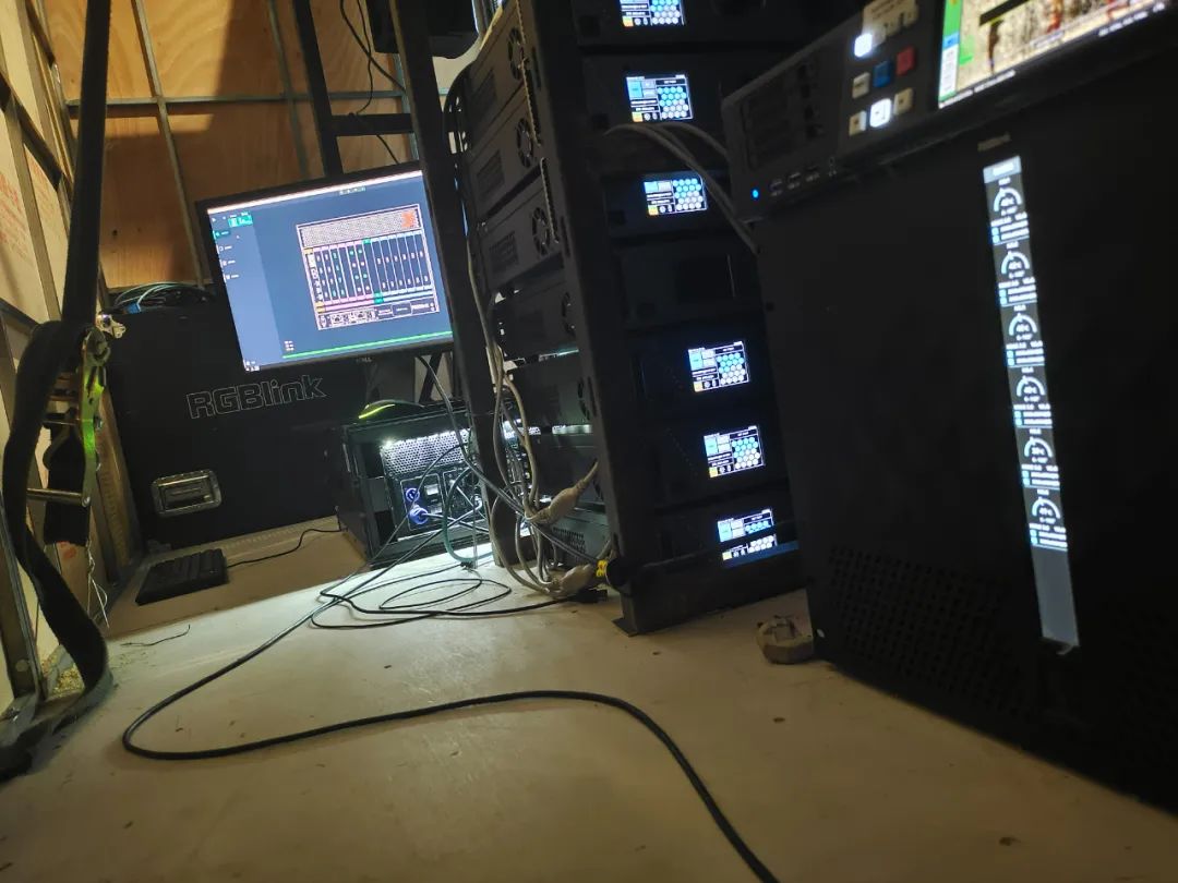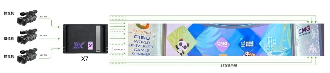 融媒體演播室現(xiàn)場:屏幕像素10496*1728,使用3路12G SDI輸入信號,左中右橫向拼接展現(xiàn)