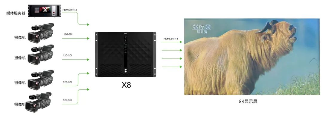 4路HDMI2.0、4路12G SDI信號源,點(diǎn)對點(diǎn)輸入,輸出到8K屏幕上