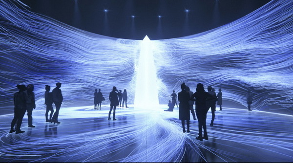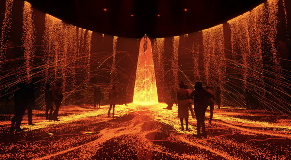 將觀眾視為能量源,并根據(jù)其動(dòng)作實(shí)時(shí)生成圖形粒子,粒子流入象征著鋼鐵化身的LED燈塔中,使觀眾可以體驗(yàn)到“煉鐵過程”的具象化。
