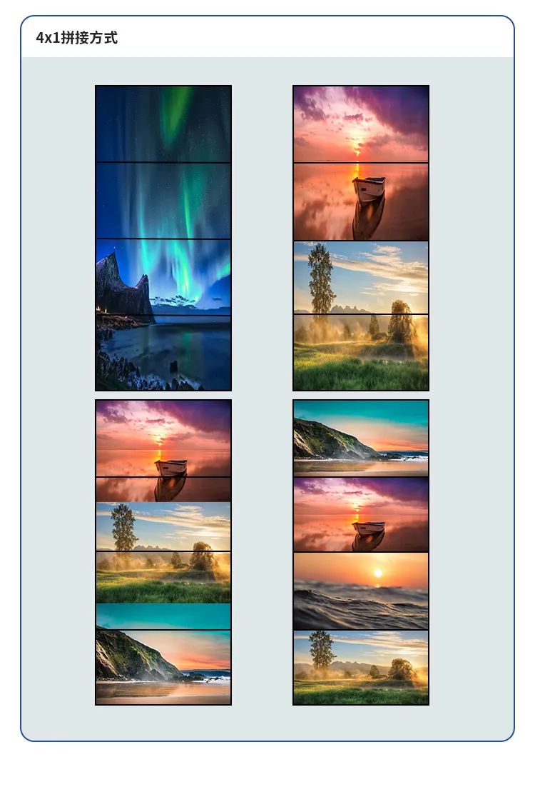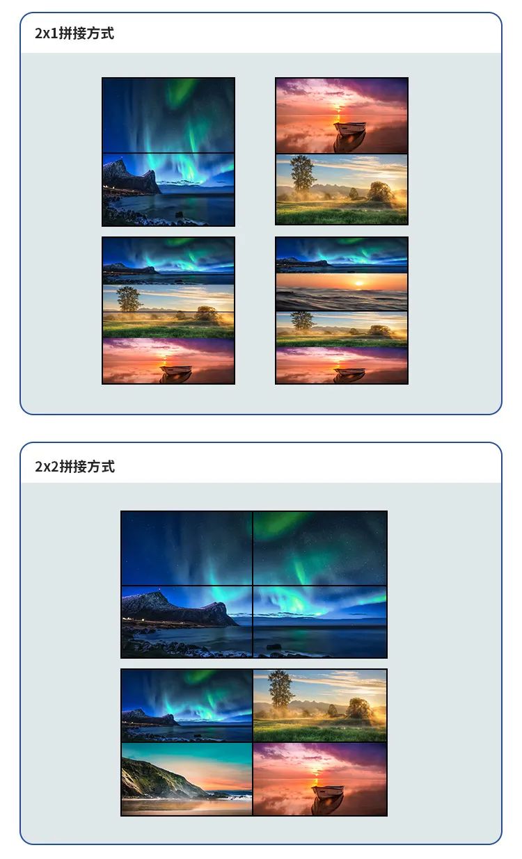 這款產(chǎn)品最強(qiáng)大的地方,就是它可以在拼接時(shí)同時(shí)實(shí)現(xiàn)分割的效果,讓您輕松享受多畫面展示的樂(lè)趣。不論是2*1、2*2、1*3、1*4等任何拼接模式,只需簡(jiǎn)單設(shè)置即可實(shí)現(xiàn)單分割、雙分割,三分割、四分割等各種顯示需求。多種模式切換讓您的展示更加豐富多彩。