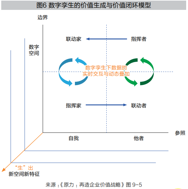 如圖6所示,在數(shù)字孿生作用下,數(shù)據(jù)實(shí)時(shí)交互與動(dòng)態(tài)疊加,參與者在“自我-他者”相對(duì)參照與相互映射中,并非保持單一的“指揮家”與“聯(lián)動(dòng)者”角色,而是以兩種角色持續(xù)交互與疊加的方式參與其中。隨著價(jià)值聯(lián)動(dòng)的展開,新特征得以持續(xù)涌現(xiàn),原有的價(jià)值體系變得立體起來(lái),不斷突破價(jià)值新空間!爸笓]家”與“聯(lián)動(dòng)者”得以新生,聯(lián)動(dòng)方式得以延展,不斷打通物理空間與數(shù)字空間的界限。以“生”的方式維系供需“非均衡”的基本常態(tài),通過(guò)價(jià)值共享與價(jià)值共創(chuàng)持續(xù)互動(dòng),涌現(xiàn)商業(yè)新特征、釋放價(jià)值新空間,這是一個(gè)生生不息的過(guò)程。