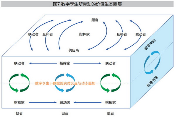 數(shù)字孿生不僅是一個(gè)技術(shù)工具,更是一個(gè)包容多方參與的舞臺(tái)。正如圖7所示,在圖上面的“價(jià)值圈層”中有指揮家、互補(bǔ)者、聯(lián)動(dòng)者三個(gè)角色。這三個(gè)角色對(duì)應(yīng)的主體不是固定的,可能是核心企業(yè),也可能是其上下游的供應(yīng)商與渠道。一個(gè)主體的角色也是不斷變化的,這是因?yàn)樽晕遗c他者的角色轉(zhuǎn)化與相互帶動(dòng),需要結(jié)合 “實(shí)體空間”和“數(shù)字空間”兩個(gè)參考系來(lái)一起共融。