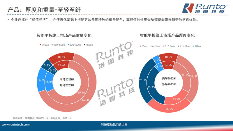 根據洛圖科技(RUNTO)線上監(jiān)測數(shù)據顯示,今年上半年智能平板線上市場中,產品重量小于450g的占比為15.1%,較去年同期增長了2.5個百分點;產品厚度小于7.5mm的占比為68.2%,較去年同期增長了9.1個百分點。