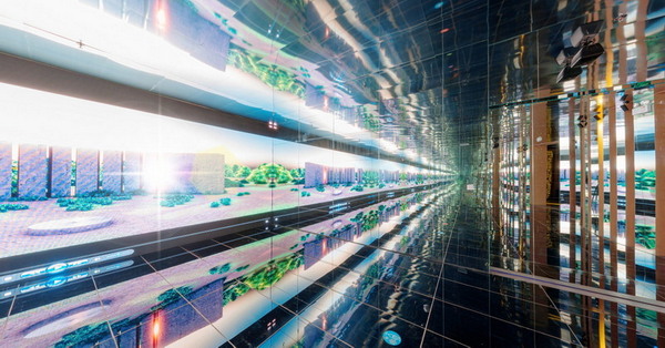 山西好風(fēng)光沉浸式展區(qū)采用720°鏡像長廊,參觀者步入長廊空間,鏡面縱深感使觀眾如同懸空跨過山西每一寸土地。