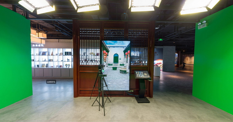 該展區(qū)有三個互動體驗區(qū)——票匯文創(chuàng)互動打印數(shù)字長屏、山西大院VR游、虛擬演播室。游客可以將票號文化、優(yōu)美風(fēng)景、愛情宣言、特色剪紙、流行卡通進行數(shù)字化處理,并打印帶走。戴上VR眼鏡,穿越到古老的大院,看看喬家與王家的百年景觀。