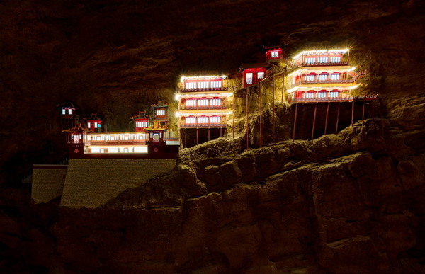 在“秘境”展區(qū),數(shù)字再現(xiàn)藝術(shù)所蘊含的文化靈光,經(jīng)歷百年千年依然矗立在這片神奇土地上的文物,永樂宮、巖山寺、開化寺、綿山、娘子關(guān)、平遙古城、云岡石窟……拾級而上沉浸式景區(qū),仿佛走進了微縮空間,一覽其全部造型。