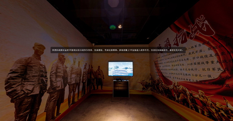 英勇抗戰(zhàn)展區(qū)運用VR游戲以抗日戰(zhàn)爭為背景,仿真模擬,傳承民族精神。參觀者戴上VR設(shè)施進入戰(zhàn)爭年代,沉浸在浴血奮戰(zhàn)中,感受紅色文化。