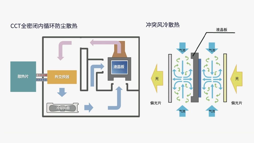 CCT全密閉內循環(huán)防塵散熱技術:采用內循環(huán)散熱原理,將密閉空間中的熱量利用冷媒技術傳遞到外部,再配合全新的風扇固定設計,確保高效散熱。與此同時,全密閉光路設計避免了灰塵進入核心部件,無需過濾網,既保證了機器長期使用的穩(wěn)定品質,又為用戶節(jié)省了維護成本。