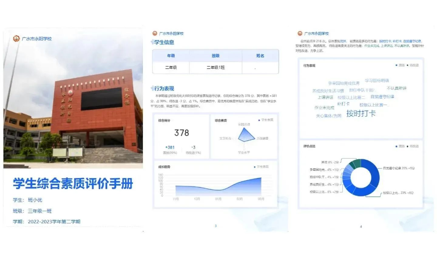 該功能可全方位記錄學(xué)校課堂表現(xiàn)、校內(nèi)外實(shí)踐、校外表現(xiàn)等,學(xué)生表現(xiàn)也將自動(dòng)同步家長,老師還可通過多種方式與家長溝通,共同引導(dǎo)學(xué)生健康成長。