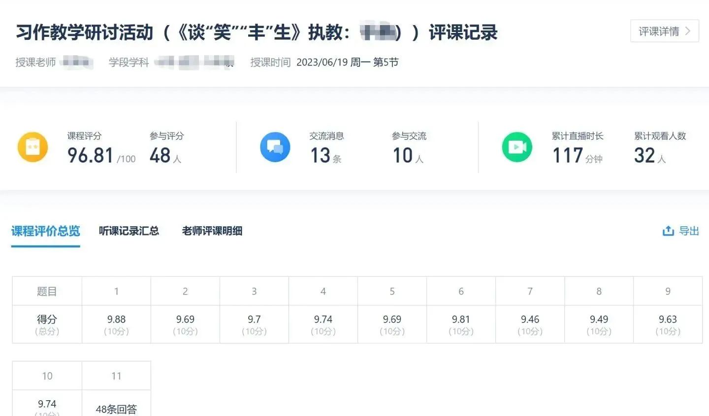 以聽課評(píng)課為例,南校區(qū)的老師在希沃魔方上發(fā)起聽課評(píng)課,兩個(gè)校區(qū)的老師可通過二維碼或鏈接進(jìn)入群內(nèi),在線觀看公開課,在課后還能通過科學(xué)的評(píng)分表進(jìn)行反饋。目前,惠州市第十一小學(xué)累計(jì)產(chǎn)生線上化教研交流研討近800次。