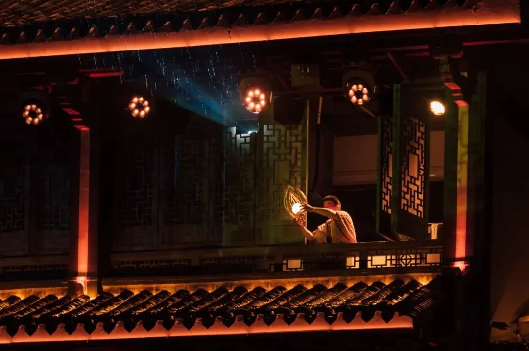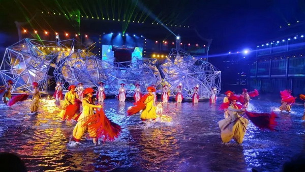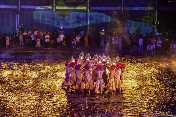 演出在由三座樓閣包圍的露天舞臺(tái)進(jìn)行,以“漁夫撒網(wǎng)”為開(kāi)端,演員們陸續(xù)根據(jù)演出情節(jié)進(jìn)場(chǎng),身著漁夫、海女的裝扮,手持燈籠、魚(yú)簍,在波光粼粼好似變幻莫測(cè)的大海的水面舞臺(tái)上,翩然起舞。