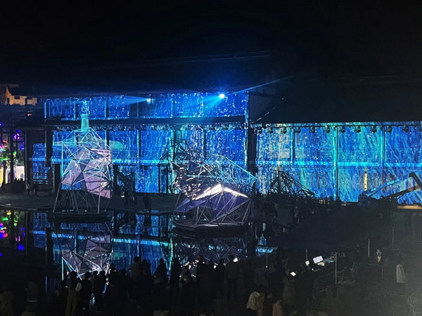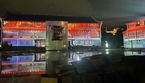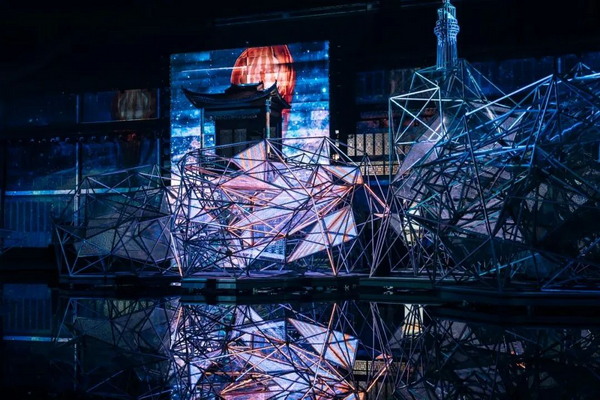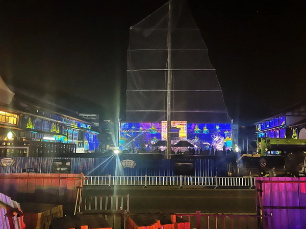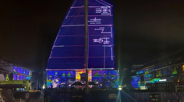 贏康為演出場(chǎng)地的三面樓閣建筑以及現(xiàn)場(chǎng)的船帆雕塑進(jìn)行了投影方案設(shè)計(jì)以及現(xiàn)場(chǎng)施工調(diào)試等工作。