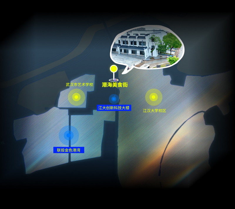 潮海美食街的位置得天獨(dú)厚,可輻射周圍高校學(xué)生、居民及前來此地的游客,并運(yùn)用光影科技美學(xué),打造出武漢首個(gè)擁有天幕的“網(wǎng)紅”美食街,幫助其在未來打響沌口的美食街名片。