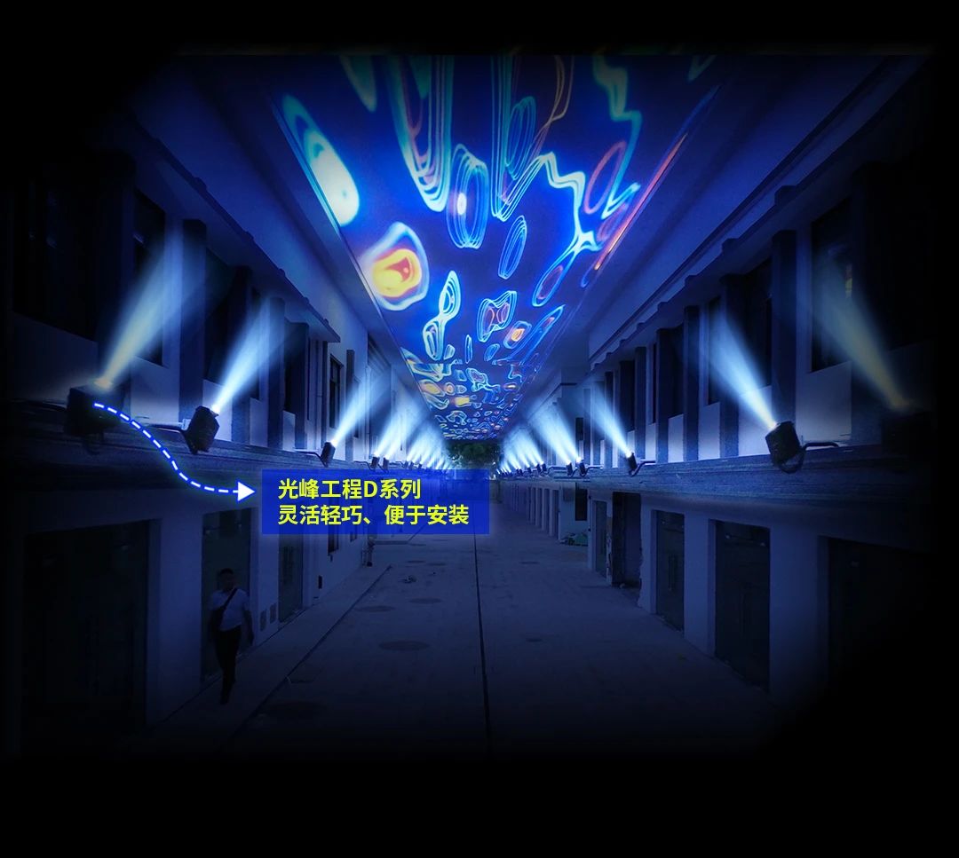 光峰工程D系列體積小、支持360°全方位自由安裝,可選配多款短焦鏡頭,便于在商業(yè)街等空間的靈活安裝,游客駐足仰望,便可置身其中,天幕宛如一條夢(mèng)幻的緞帶,架在街道上空,隨著畫面變化,絢爛多彩且恢宏壯觀。
