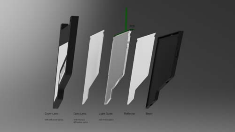 用于車輛尾燈的超薄、高性能的多功能燈模塊。其原理是通過特定的微光學(xué)透鏡(幾微米大小,比鹽粒還。┣度攵鄬庸鈱W(xué)堆棧系統(tǒng)中發(fā)光。該光學(xué)系統(tǒng)厚度僅為5毫米,能夠大幅減少車輛尾燈空間需求,通過提升車身結(jié)構(gòu)剛性也能幫助提高車輛安全性。同時(shí),高效率的光學(xué)系統(tǒng)能夠讓能源消耗降低80%。該系統(tǒng)能夠提供均勻照明外觀和多種多色車輛照明應(yīng)用。