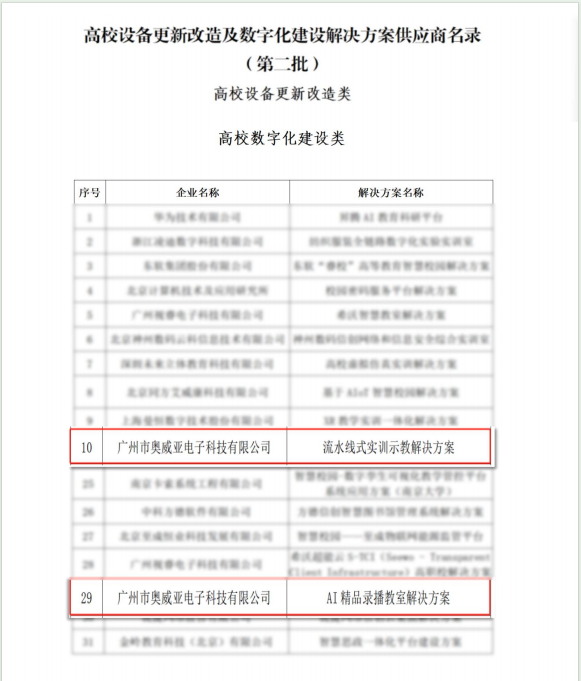 近日,中國高等教育學(xué)會(huì)高校設(shè)備更新改造及數(shù)字化建設(shè)解決方案供應(yīng)商名錄(第二批)已公布。 奧威亞“AI精品錄播教室解決方案”、“流水線式實(shí)訓(xùn)示教解決方案”全部入選高校設(shè)備更新改造及數(shù)字化建設(shè)解決方案供應(yīng)商名錄。此次入選不僅肯定了奧威亞服務(wù)高校內(nèi)涵式高質(zhì)量發(fā)展所發(fā)揮的示范作用,也是行業(yè)對(duì)奧威亞核心技術(shù)自主可控實(shí)力的高度認(rèn)可。
