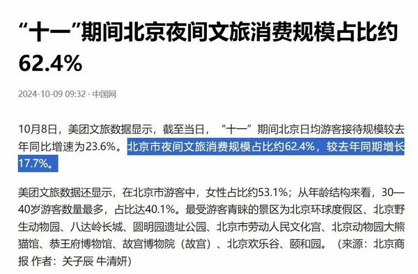 我們來(lái)看一組數(shù)據(jù):2024年 “十一” 期間,北京市夜間文旅消費(fèi)規(guī)模占文旅經(jīng)濟(jì)的比重為62.4%,較去年同期增長(zhǎng)17.7%。