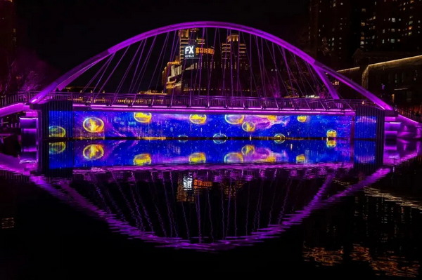 亮馬河作為燈光節(jié)核心區(qū)域被絢爛光影環(huán)繞,6臺(tái)松下PT-SRZ34KC各司其職,4臺(tái)在盛福健步橋的繩幕與橋體上投射出斑斕色彩與靈動(dòng)畫(huà)面,光影搖曳于河面之上,如夢(mèng)似幻;