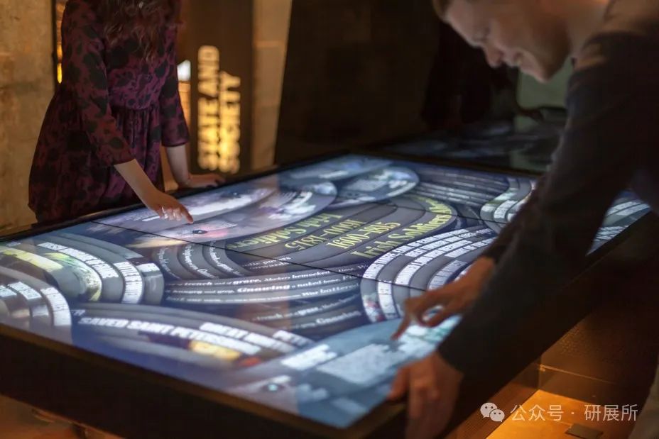 設(shè)計(jì)師將互動(dòng)屏設(shè)置成一系列的“堆!,稱其為“故事井”。觀眾可從向下進(jìn)行窺看關(guān)于愛爾蘭“家庭”、“土地”和“勞工”的內(nèi)容。