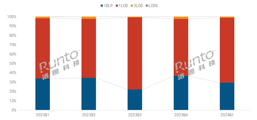 根據(jù)洛圖科技(RUNTO)線上監(jiān)測數(shù)據(jù)顯示,2024年第一季度,DLP技術(shù)在線上市場的份額降到了三成以內(nèi),較去年同期下降了4.5個百分點。